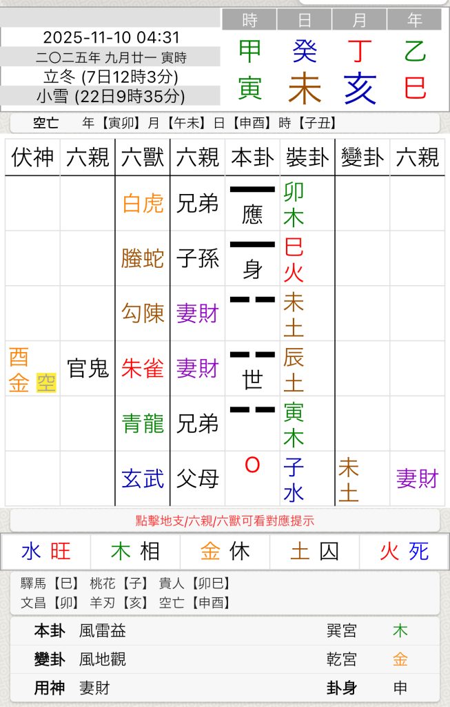 占いの方法: 六爻占(コインや動画にある八面サイコロで六本の爻を立てる)。 卦に出た「六親」(父母、兄弟、官鬼、妻財、子孫など)を配当し、用神(判断の対象)を決めて読む。 空亡・冲合・刑害・世爻応爻などの理論を駆使して細かく断じる。