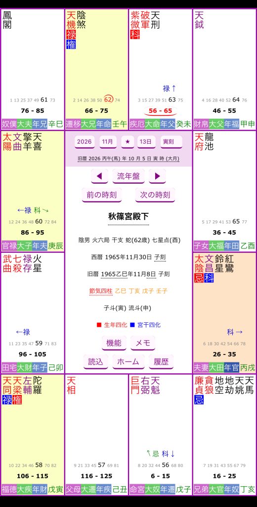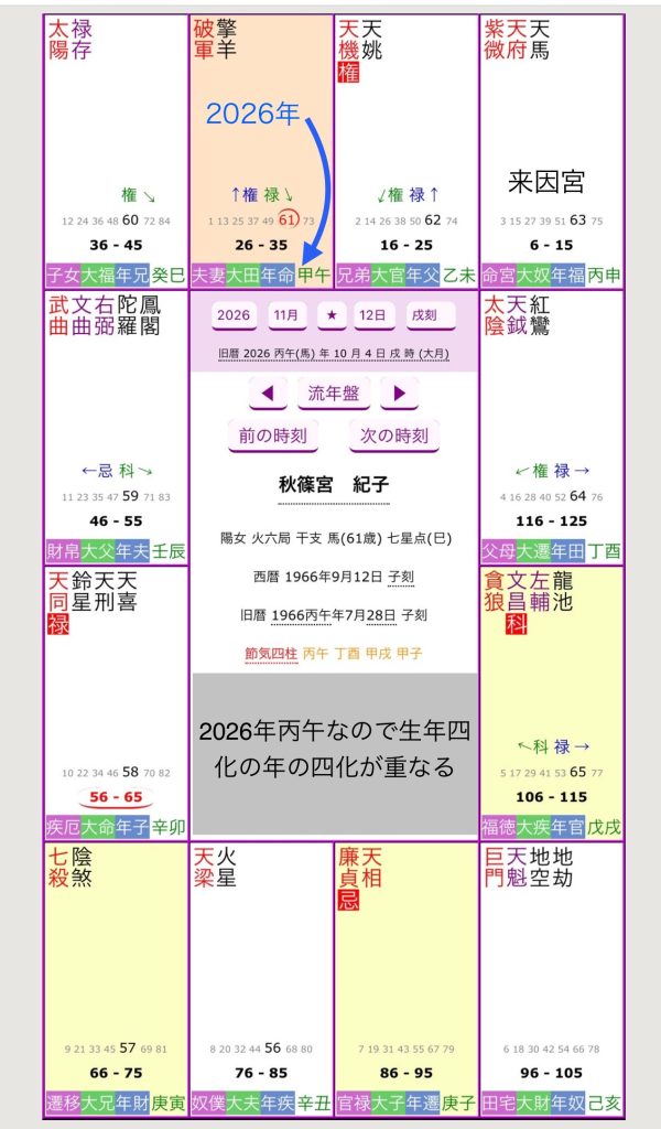 2026年は唯一の自分星(廉貞星)が年遷移宮に入ります。外交特に海外に行くのは控えた方が良い。