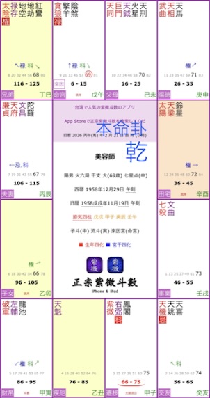 美容師の星は貪狼星です。ご自身の命盤を占い師に依頼して作成してみましょう。その前に例題で予習しましょう。下記においては命宮にあります。